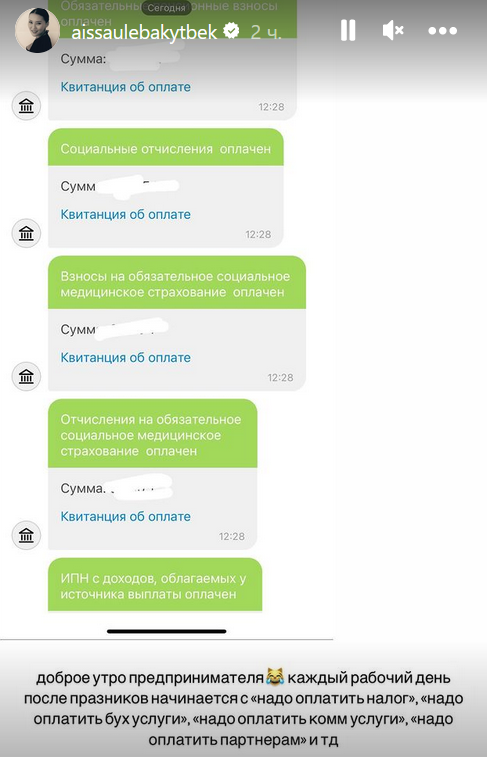 После трехдневных выходных в честь Наурыза она показала скриншот банковского приложения, в котором видны квитанции. Они подписаны следующим образом: "Обязательные пенсионные взносы — оплачен", "Социальные отчисления — оплачен", "Взносы на обязательное социальное медицинское страхование — оплачен", "Отчисления на обязательное социальное медицинское страхзование — оплачен". Суммы не видно.