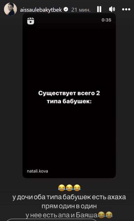 Айсауле опубликовала в своих сторис ссылку на видео, в котором описываются разные типы бабушек, передает медиа-портал Сaravan.kz. Бабушки первого типа, как показано в видео, всегда готовы посидеть с внуками и стараются накормить их, бабушкам второго типа приходится выкраивать время для семьи в плотном деловом расписании, а еще они просят внуков называть их по имени.