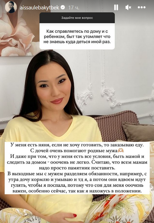 "Как справляетесь по дому и с ребенком? Быт так утомляет, что не знаешь, куда деться иной раз", — написала Айсауле одна из читательниц.