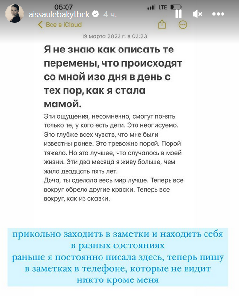 "Прикольно заходить в заметки и находить себя в разных состояниях. Раньше я постоянно писала здесь (в сториз Instagram — прим. ред. Caravan.kz), теперь пишу в заметках в телефоне, которые не видит никто, кроме меня", — написала она.