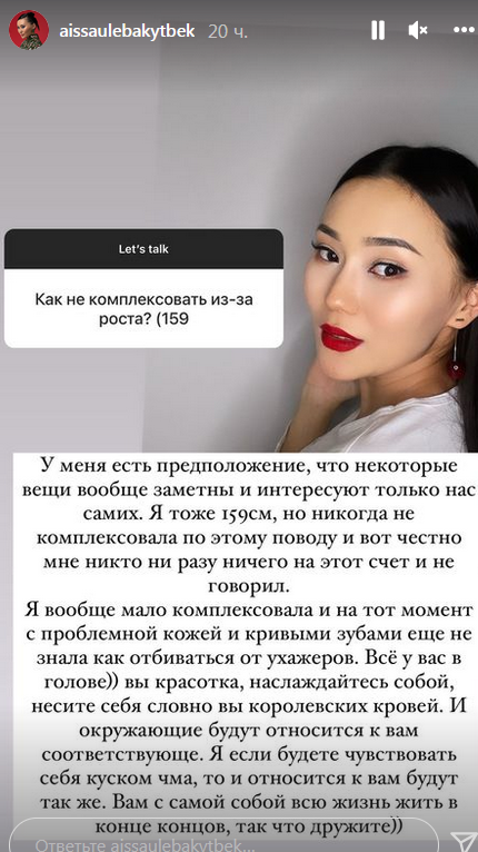 В частности, подписчица хотела знать, как не комплексовать из-за роста в 159 см, передаёт медиа-портал Сaravan.kz.