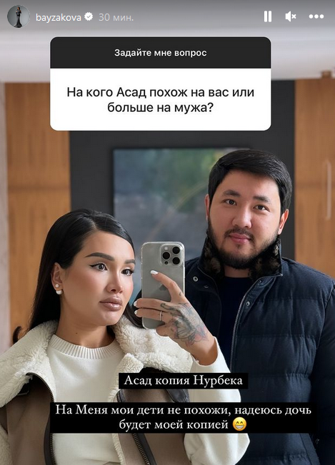 "Асад — копия Нурбека. На меня мои дети не похожи, надеюсь, что дочь будет моей копией", — ответила Байзакова.