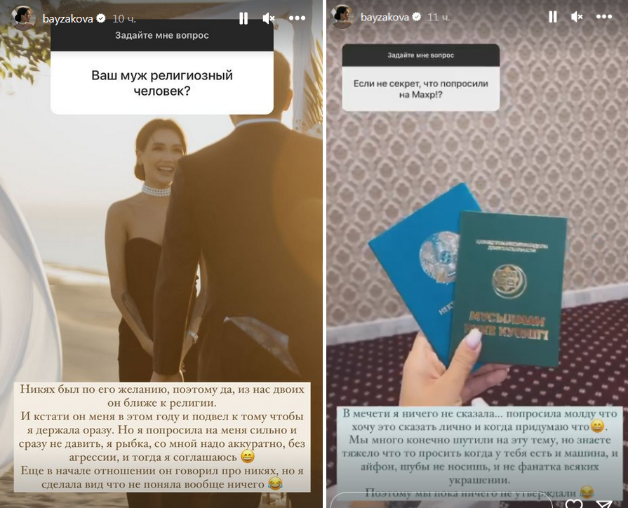 По инициативе супруга пара провела обряд бракосочетания в мечети — фотографии этого свидетельства Айжан также опубликовала в сториз, передает медиа-портал Сaravan.kz.