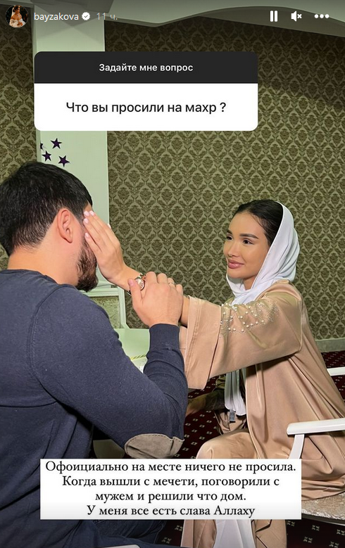 "Официально на месте ничего не просила. Когда вышли из мечети, поговорили с мужем и решили, что дом. У меня все есть, слава Аллаху", — написала певица в ответ на вопрос подписчика.