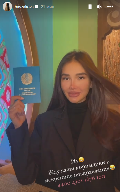 Айжан опубликовала в сториз фото со свидетельством и браке и написала, что ждет поздравления, прикрепив номер карты.