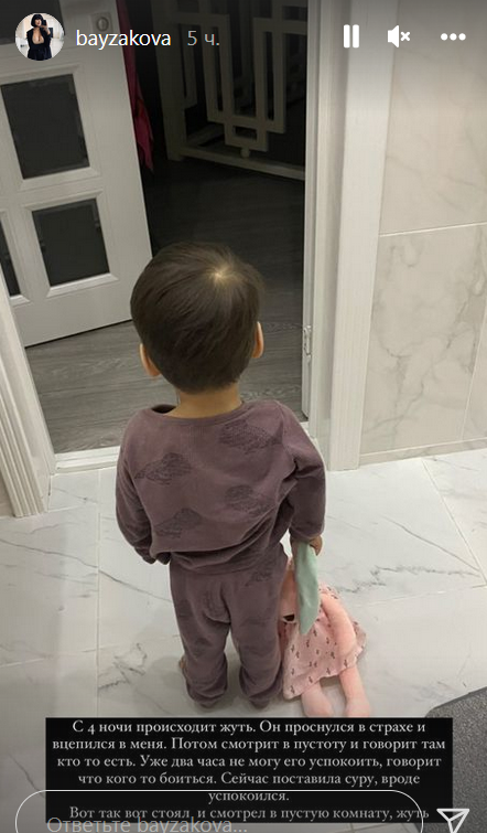 "С 4 ночи происходит жуть. Он проснулся в страхе и вцепился в меня. Потом смотрит в пустоту и говорит, там кто-то есть. Уже два часа не могу его успокоить, говорит, что кого-то боится. Сейчас поставила суру, вроде успокоился. Вот так вот стоял и смотрел в пустую комнату, жуть", — рассказала артистка.