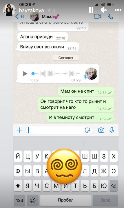 Также она показала скриншот переписки со своей мамой, в которой говорит, что Алану показалось, будто кто-то рычит и смотрит на него.