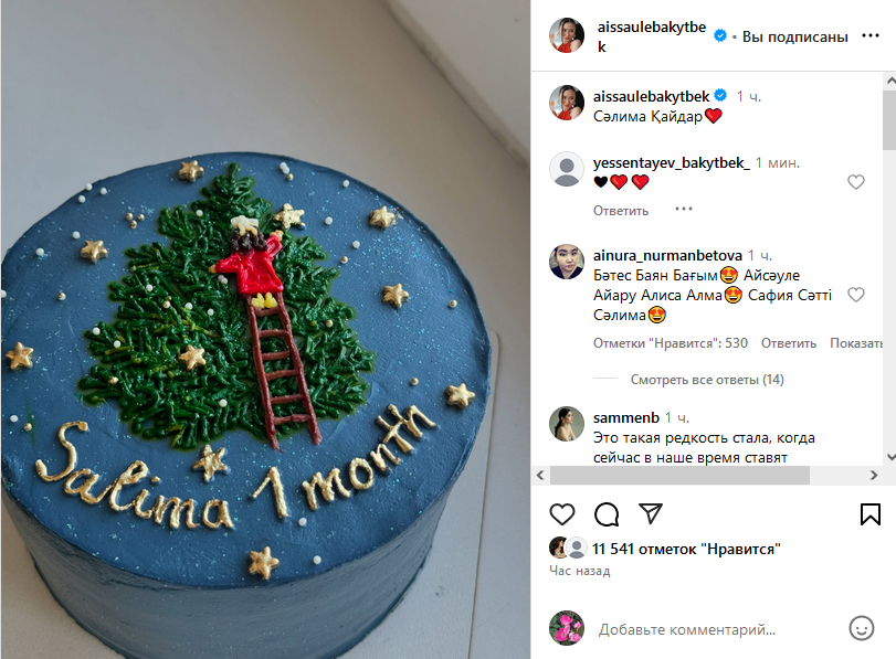 Сегодня Айсауле опубликовала снимок торта с именем, сообщив, что ее третью дочь зовут Сәлима Қайдар.