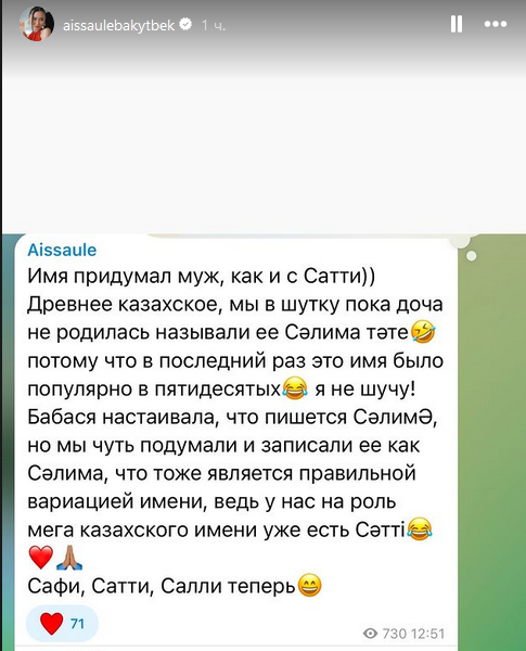 В своем Telegram-канале Айсауле рассказала, что имя выбрал ее супруг.
