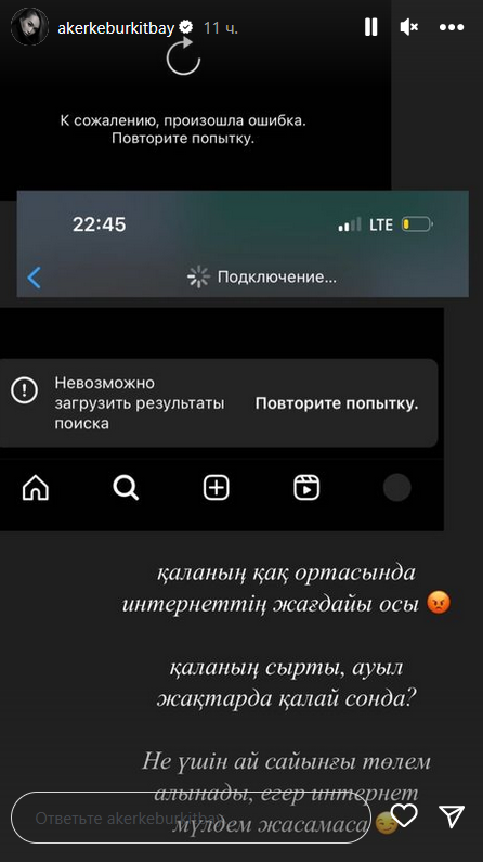 "Вот так обстоит ситуация с интернетом в самом центре города. Что же тогда происходит за городом, в аулах? За что каждый месяц приходится платить, если интернет совсем не работает?" — написала артистка в комментарии к скриншоту.