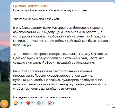 «Человек, изображённый на фоне гор Акжар, не совершает никаких непристойных действий, как было подано в публикации. Это — оператор дрона, который выполнял съёмку местности. Цвет его брюк и ракурс совпали с оттенком ландшафта, что создало визуальный эффект, введший в заблуждение«, — пояснил представитель акимата.