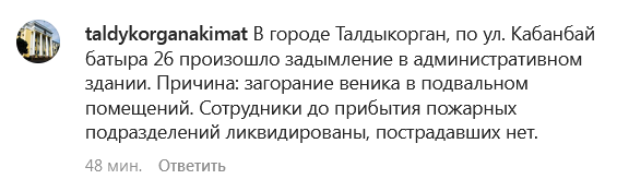 "В городе Талдыкорган, по ул. Кабанбай батыра, 26 произошло задымление в административном здании. Причина: загорание веника в подвальном помещении. Сотрудники до прибытия пожарных подразделений эвакуированы, пострадавших нет", — говорит в сообщении.