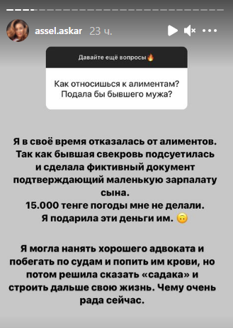 Актриса ответила на это: "Я в своё время отказалась от алиментов. Так как бывшая свекровь подсуетилась и сделала фиктивный документ, подтверждающий маленькую зарплату сына. 15 тысяч тенге погоды мне не делали. Я подарила им эти деньги. Я могла нанять хорошего адвоката и побегать по судам и попить им крови, но потом решила сказать "садака" и строить дальше свою жизнь. Чему очень рада сейчас".