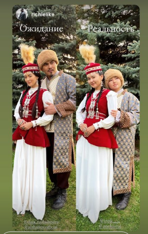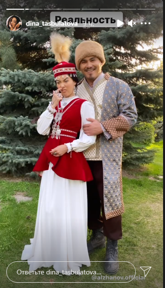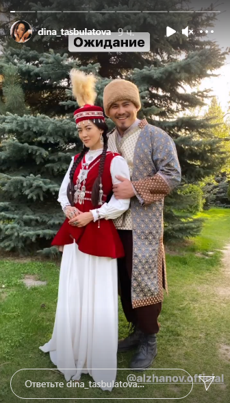 Она выложила две фотографии, на которых она стоит с актёром Олжасом Альжановым, и оба в национальных костюмах. Одна подписана как "Ожидание", а вторая — "Реальность", и на второй Дина ковыряет в носу.