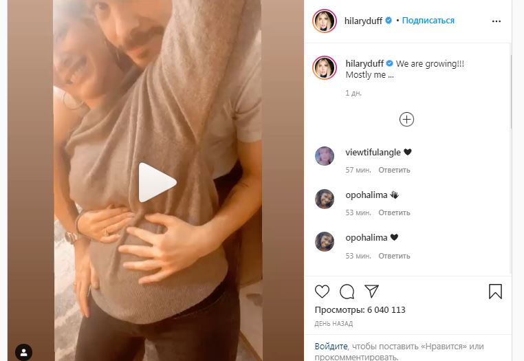 «Мы растем! В основном я…», — шуточно прокомментировала Дафф видео, где Мэттью Кома нежно придерживает ее округлившийся живот. Аналогичным видео поделился у себя в инстаграме и Кома.