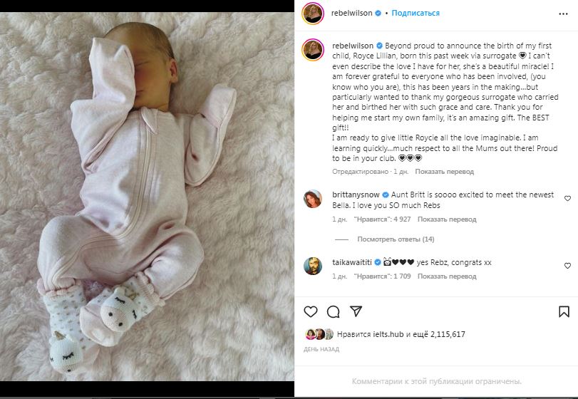 Суррогатная мать родила артистке дочь на прошлой неделе. Девочку назвали Ройс Лилиан.