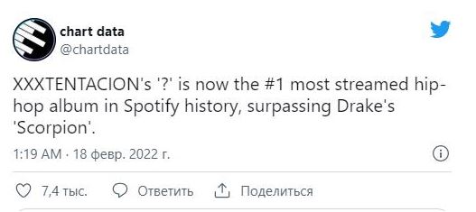 Работу XXXTentacion прослушали больше 7,884 млрд раз, в то время как альбом Дрейка набрал 7,883 млрд прослушиваний.
