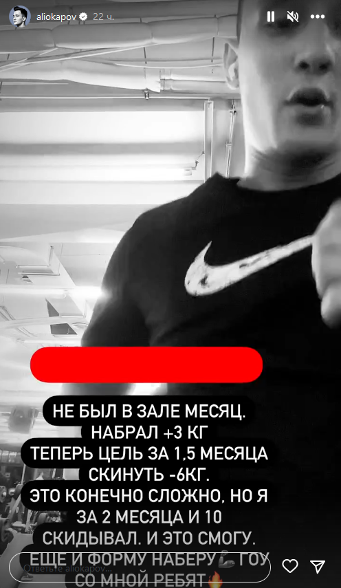 "Не был в зале месяц. Набрал 2 кг. Теперь цель за 1,5 месяца скинуть 6 кг. Это, конечно, сложно, но я за 2 месяца и 1- скидывал, и это смогу. Еще и форму наберу", — рассказал Али Окапов в сториз.
