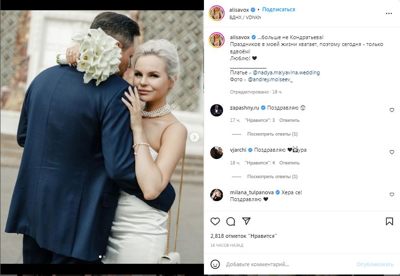 — Больше не Кондратьева! Праздников в моей жизни хватает, поэтому сегодня только вдвоем! Люблю! — сообщила Вокс о своем замужестве, пишет Gazeta.ru