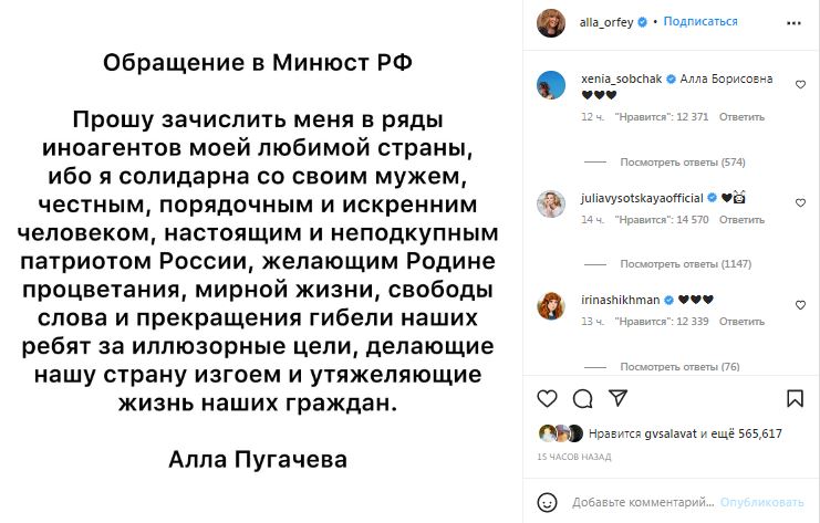Пугачева заявила, что солидарна со своим мужем Максимом Галкиным, "настоящим и неподкупным патриотом России", который желает своей стране "мирной жизни, свободы слова" и прекращения гибели людей "за иллюзорные цели", передает Tengrinews.kz.