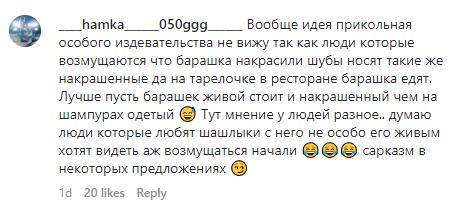 "Я, конечно, люблю шашлык из баранины, но вы не думаете, что это перебор?" — задаётся вопросом автор видео. Женщина, которая снимает, предполагает, что животное просто покрасили из балончика, что может быть очень вредным для его здоровья. Она возмущается и настаивает, что в таких акциях должны участвовать только люди.
