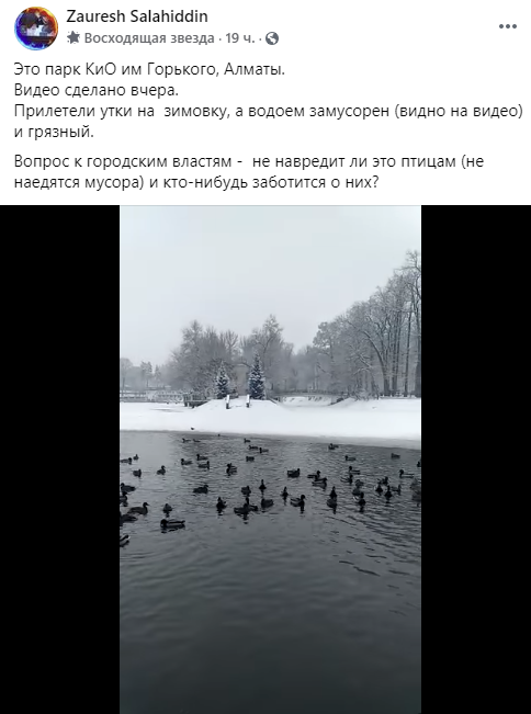 "Это парк имени Горького. Прилетели утки на зимовку, а водоем замусорен (видно на видео) и грязный. Вопросы к городским властям: не навредит ли это птицам (не наедятся мусора) и кто-нибудь заботится о них?" — подписаны опубликованные кадры в городском паблике.