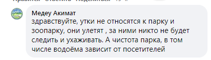 Представители уполномоченных органов пояснили под публикацией, что "утки не относятся к парку и зоопарку".