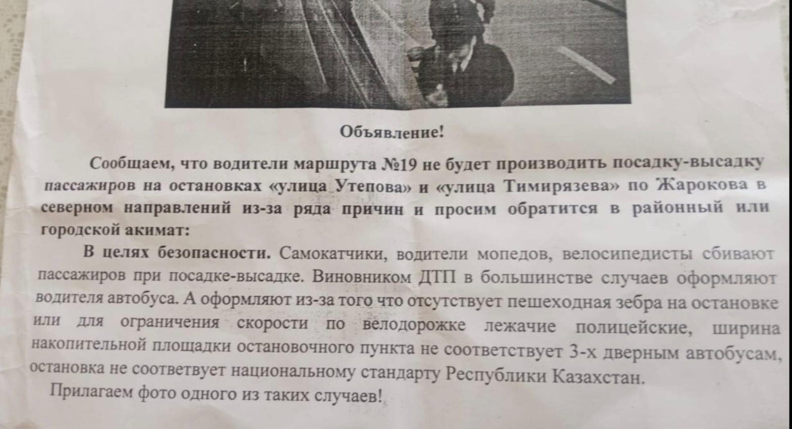 В нем сообщается, что водители популярного автобусного маршрута 19 не будут высаживать пассажиров на двух остановках, сообщает Caravan.kz. В частности, речь идет об остановках "Улица Утепова" и "Улица Тимирязева" по ул. Жарокова в северном направлении. Недовольным предлагается обратиться в районный или городской акимат.