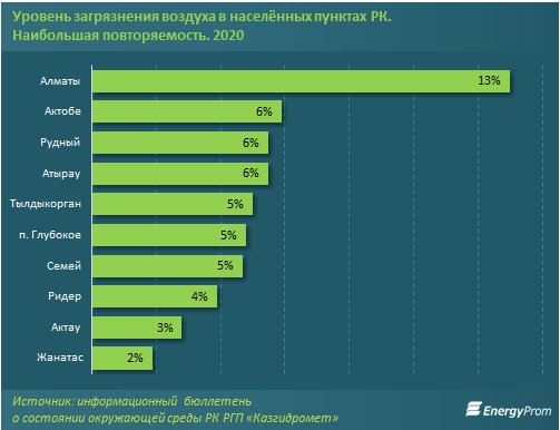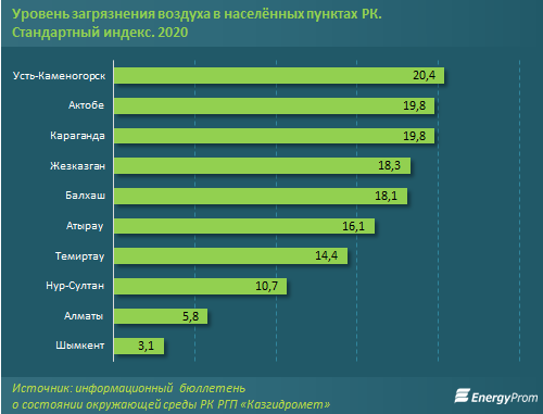 В 2020 году городами с самым загрязнённым воздухом в стране были признаны Алматы, Нур-Султан, Шымкент, Усть-Каменогорск, Караганда, Актобе, Жезказган, Балхаш, Атырау и Темиртау.
