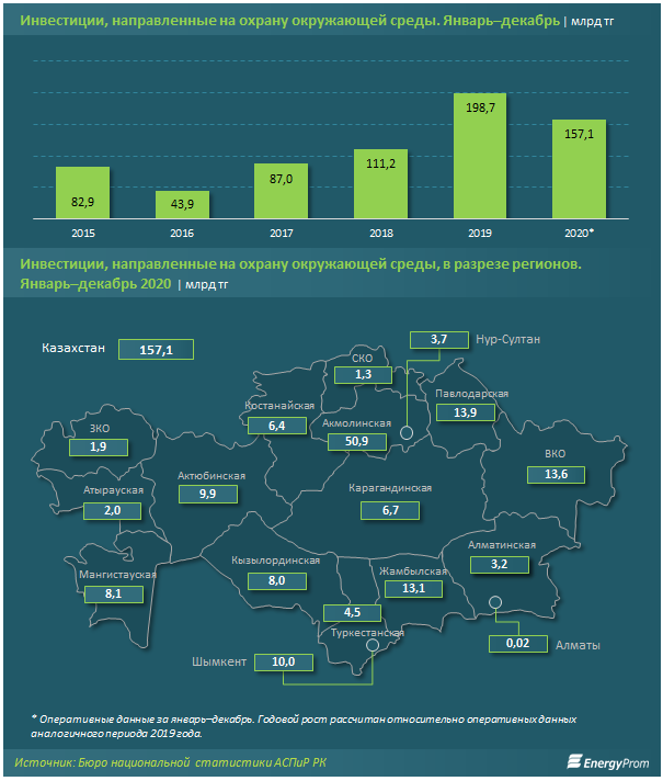 Так, за январь–декабрь 2020 года они составили лишь 18,1 млн тг — в 6,3 раза меньше, чем за аналогичный период 2019 года. В целом по РК объём инвестиций, направленных на охрану окружающей среды, в январе–декабре 2020 года достиг 157,1 млрд тг — на 33,8% больше, чем годом ранее.