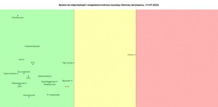 в "зеленой" — все остальные регионы: Нур-Султан и Шымкент, а также Алматинская, Актюбинская, Атырауская, Акмолинская, Западно-Казахстанская, Восточно-Казахстанская, Жамбылская, Карагандинская, Костанайская, Кызылординская, Мангистауская, Северо-Казахстанская, Павлодарская и Туркестанская области.
