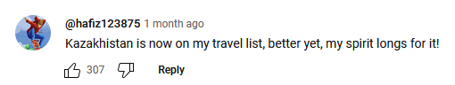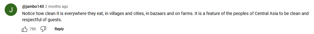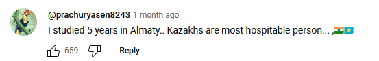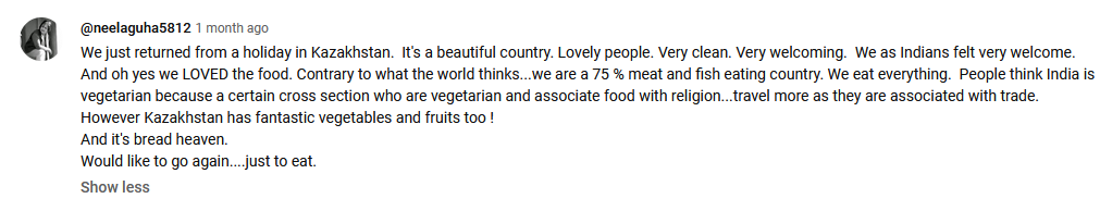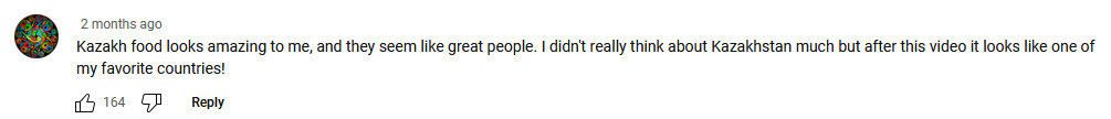 — Казахская еда выглядит великолепно на мой вкус, и они кажутся прекрасными людьми. Я никогда не думал о Казахстане, но после этого видео он выглядит как одна из моих любимых стран!