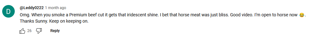 — О боже. Когда коптишь говяжью вырезку премиум-класса, она приобретает такой переливающийся блеск. Держу пари, что конина была просто блаженством. Хорошее видео. Теперь я открыт для конины. Спасибо, Сонни. Продолжай в том же духе.