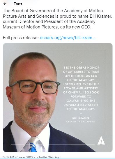— Под руководством Крамера в музее были успешно представлены пять выставочных этажей мирового класса, посвященных искусству кино, он успешно обеспечивал взаимодействие музея и киноакадемиков для создания его коллекции , — говорится в сообщении пресс-службы.