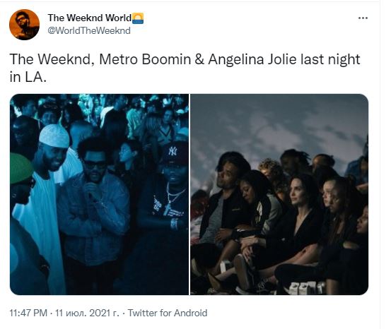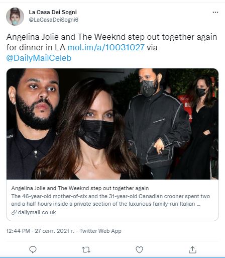 Папарацци застали Джоли и The Weeknd на выходе из ресторана (где они провели около трех часов) и стали свидетелями того, как актриса села в машину певца. По информации западных СМИ, пара отправилась в особняк Тесфайе.