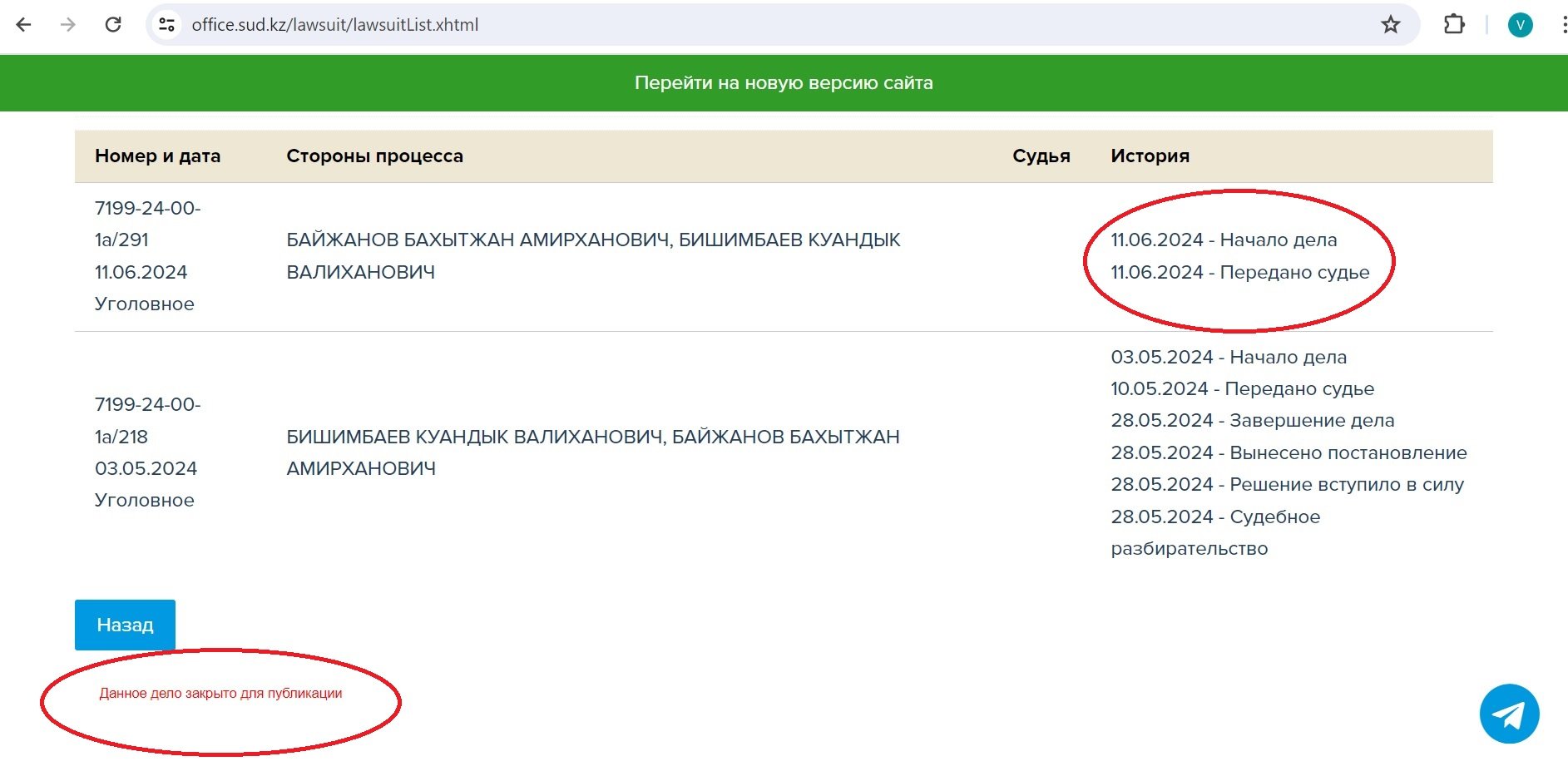 При этом на странице Специализированного межрайонного суда Астаны по уголовным делам указано, что документы «переданы в областной суд».