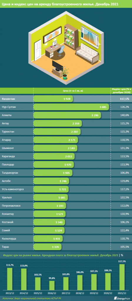 В декабре 2021 года аренда благоустроенного жилья в Казахстане подорожала сразу на 17,5% за год — до 1,9 тысячи за квадратный метр.
