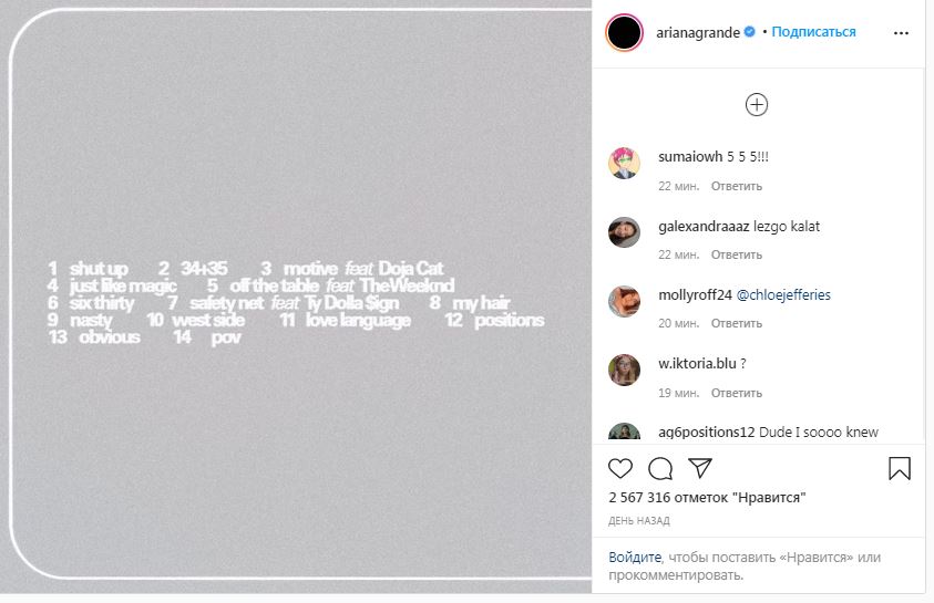 В инстаграме певицы появился треклист из 14 композиций. В него вошли совместные записи с The Weeknd, Doja Cat и Ty Dolla $ign.