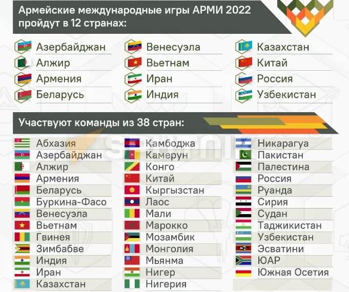 VIII Армейские международные игры стартуют сегодня, 13 августа, на территории 12 государств и продлятся до 27 августа, передает informburo.kz. Более 5000 военнослужащих из 38 стран будут соревноваться в 34 конкурсах по полевой, воздушной и морской выучке.