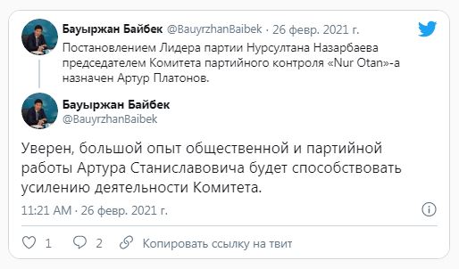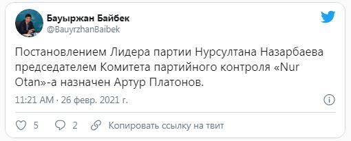 — Постановлением Лидера партии Нурсултана Назарбаева председателем Комитета партийного контроля Nur Otan-а назначен Артур Платонов, — написал он.