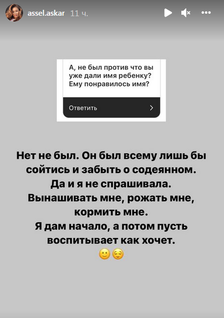Асель ответила, что не был, он был рад всему, лишь бы сойтись и забыть о содеянном. Блогерша добавила, что не стала даже спрашивать, потому что вынашивать, рожать и кормить ей, она даст начало, а потом пусть муж воспитывает малыша, как хочет.
