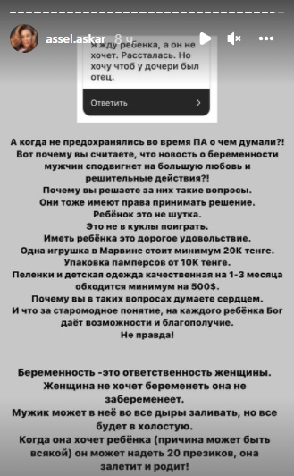 Асель Аскар в сториз в Instagram высказалась по поводу неожиданных беременностей, передаёт медиа-портал Сaravan.kz.
