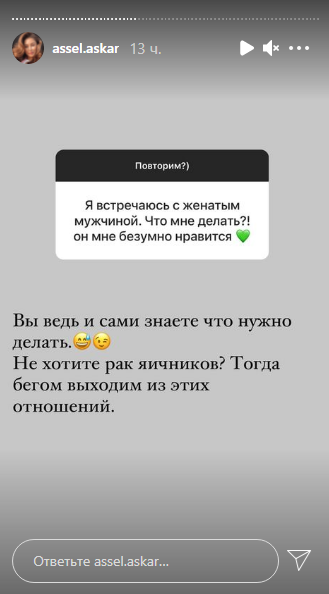 Асель Аскар в сториз в Instagram ответила на вопрос подписчицы об отношениях с несвободным мужчиной, передаёт медиа-портал Сaravan.kz.