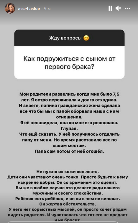 Асель спросили, как подружиться с сыном от первого брака. Тогда она рассказала, что ее родители развелись, когда ей было 7,5 лет. Аскар поделилась, что тяжело пережила ситуацию, в том числе потому, что новая женщина ее отца постаралась рассорить его с дочерью. Она добавила, что ненавидела ту женщину, но время все расставило по своим местам и отец расстался с ней.
