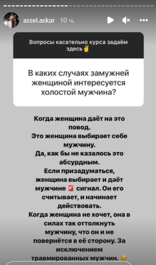 Подписчик задал ей вопрос: "В каких случаях замужней женщиной интересуется холостой мужчина?" Аскар ответила: "Когда женщина даёт повод. Это женщина выбирает себе мужчину. Да, как бы не казалось это абсурдным. Если призадуматься, женщина выбирает и даёт мужчине сигнал. Он его считывает и начинает действовать. Когда женщина не хочет, она в силах так оттолкнуть мужчину, что он и не повернётся в её сторону. За исключением травмированных мужчин".