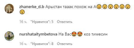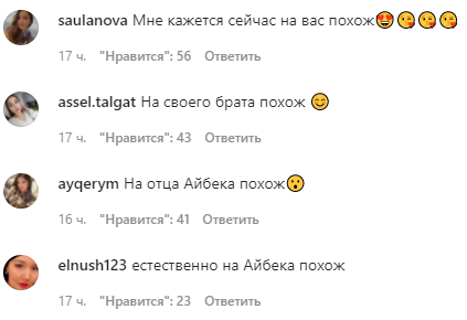 Люди стали обсуждать, на кого больше похож ребёнок. Кто-то считает, что на Асель, другие — что на её родного отца, остальные склоняются к тому, что Айбарс похож на своего родителя: