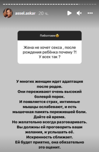 Аскар ответила: "У многих женщин идёт адаптация после родов. Они переживают очень высокий болевой порог, и появляется страх, интимные мышцы ослабевают, и есть мышечная память пережитой боли. Дайте ей время. Но желательно всегда разговаривать. Вы должны ей проговорить ваши желания и услышать её. Искренность сближает. Ей будет приятно, она обязательно это оценит".