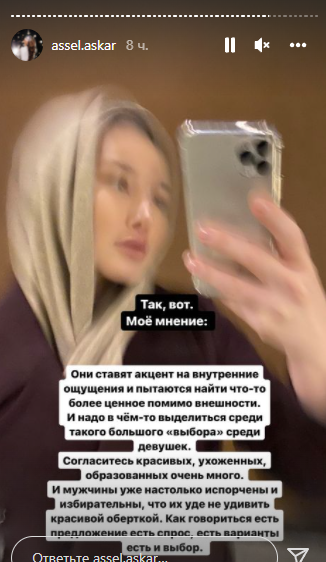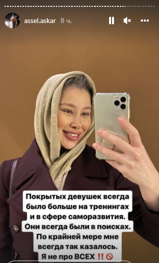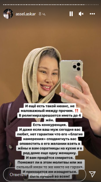 Асель Аскар показала свои фотографии с покрытой головой и рассказала, что думает о женщинах, которые закрывают голову платком: "Покрытых девушек всегда было больше на тренингах и в сфере саморазвития. Они всегда были в поисках. По крайней мере, мне всегда так казалось. Я не про всех. Они ставят акцент на внутренние ощущения и пытаются найти что-то более ценное, помимо внешности. Им надо в чём-то выделиться среди такого большого выбора среди девушек. Согласитесь, красивых, ухоженных, образованных очень много. И мужчины уже настолько испорчены и избирательны, что их уже не удивить красивой обёрткой. Как говорится, есть предложение, есть спрос, есть варианты, есть и выбор. И ещё есть такой нюанс, немаловажный, между прочим. В религии разрешается иметь до четырёх жён. Есть конкуренция. И даже если ваш муж сегодня вас любит, нет гарантии, что его "благие намерения" сподвигнут его оповестить вас о желании взять в жёны и соратницу вам на кухне, и в роддоме ещё одну женщину. И вам придётся смириться. Поможет ли в этом молитва или же сильный иман, тоже никто не гарантирует. И приходится им изощряться. Быть лучшей во всём".