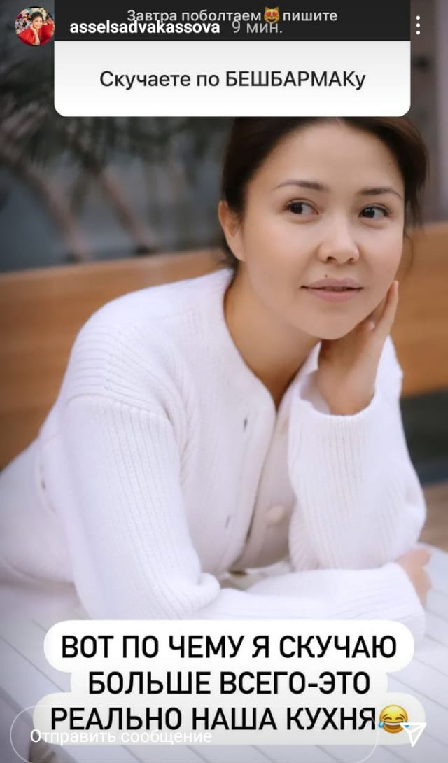 В сториз один из подписчиков спросил Асель, скучает ли она по бешбармаку. Актриса ответила, что действительно очень скучает по казахской кухне.