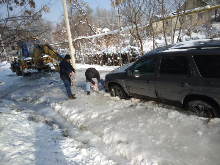 — Поселок Белбулак, улица Пушкина, не доезжая до Алтынсарина. Здесь у нас такая проблема, причем эта проблема не первый год. На протяжении 10 лет все время идет вода из канала. Когда сильные холода, она замерзает и выходит, соответственно, на улицы и топит наши дома. Здесь не то что проехать, даже ходить невозможно. Посмотрите, КамАЗ не может вытащить машину. Машина уже с ночи стоит, ее отапливают. Если не решите проблему, то даже не знаю уже, к кому обращаться, — сообщает один из местных жителей на видео.
